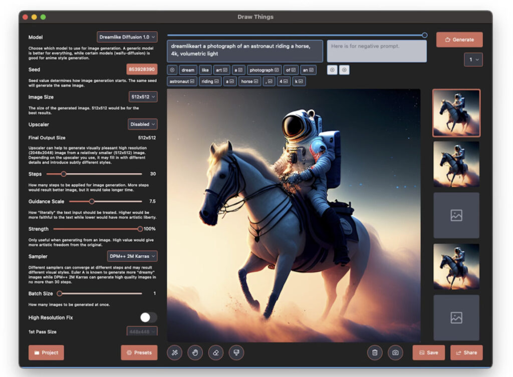 Draw things là tool để chạy model stable diffusion được tối ưu cho IOS, thậm chí có thể chạy được trên iPhone. Mặc dù không có nhiều tính năng như automatic nhưng nó lại rất dễ sử dụng.