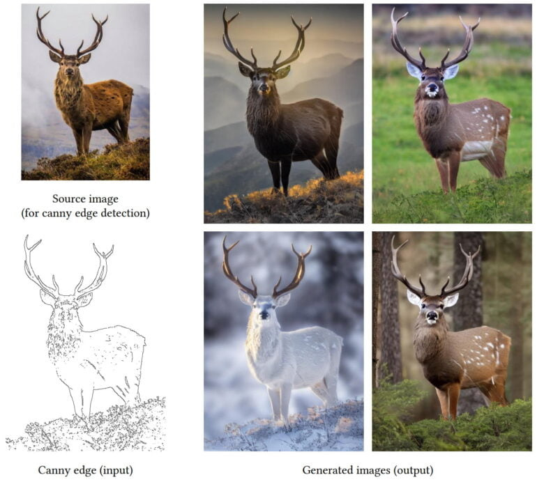 ControlNet là một phương pháp để lưu trữ các tính chất ban đầu của hình ảnh trước khi cho Stable Diffusion. Nếu như sử dụng img2img thì hình ảnh có phần không ổn định (thay đổi rất random) thì với ControlNet hình ảnh luôn lưu trữ các tính chất ban dầu của hình gốc (như trên bạn có thể thấy con nai và bãi cỏ không hề bị biến dạng dù nhiều prompt khác nhau).