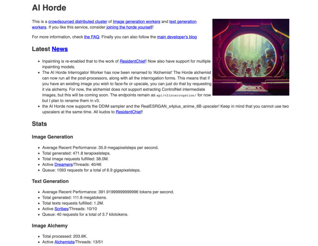 Stable Horde là trang web giúp bạn chạy Stable Diffusion “hoàn toàn miễn phí”. Đây là trang web dành cho những người có máy chạy tốt được stable diffusion tham gia để tình nguyện cho bạn tạo ảnh trên máy của họ. Trang web này được lập ra nhằm mục đích nghiên cứu.