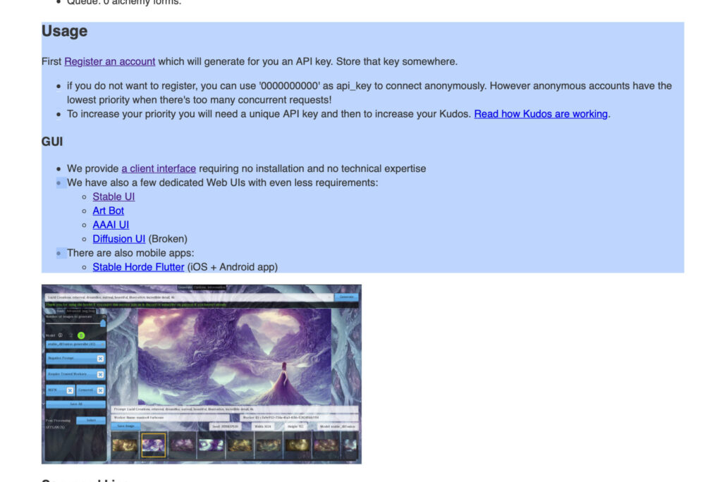 Tất cả những gì bạn cần làm là vào trang web này https://stablehorde.net để đăng ký tài khoản. Sau khi bạn đăng ký tài khoản stable horde sẽ cho bạn một API key. Khi bạn có API key hãy vào lại trang chủ và kéo xuống phần “Usage” để xem hướng dẫn cách sử dụng Stable Horde nhé.