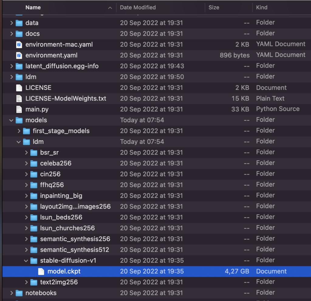 Các bạn còn nhớ file weight 4GB đã tải khi nãy không? Hãy đổi tên nó thành model.ckpt rồi bỏ nó vào thư mục này bên trong cái thư mục vừa clone về. Trông như này.
