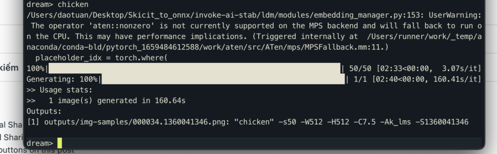 Như vậy là các bạn đã cài đặt xong và có thể chạy được stable diffusion cơ bản bằng CLI rồi. Mình recommend các bạn đọc thêm documentation của CLI này ở link dưới đây để có thể biết cách tinh chỉnh ( các thông số khi nhập prompt như độ lớn, độ random, seed ,v…. v… ).