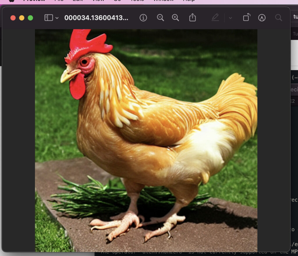 Ở giao diện này khi các bạn nhập input vào 1 đoạn prompt ( gợi ý ) thì nó sẽ trả ra hình ảnh được dựng nên bằng text2img ( từ ngữ thành hình ảnh ) ở thư mục. Chúng ta hãy gõ chicken vào thử xem nó sẽ cho ra cái gì.