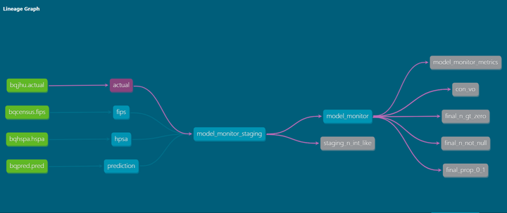 Khi chạy project dbt phía trên hình chúng ta có thể thấy được model_monitor có nguồn dữ liệu phục thuộc vào model_monitor_staging và tiếp tục phụ thuộc vào actual và bqjhu.actual.