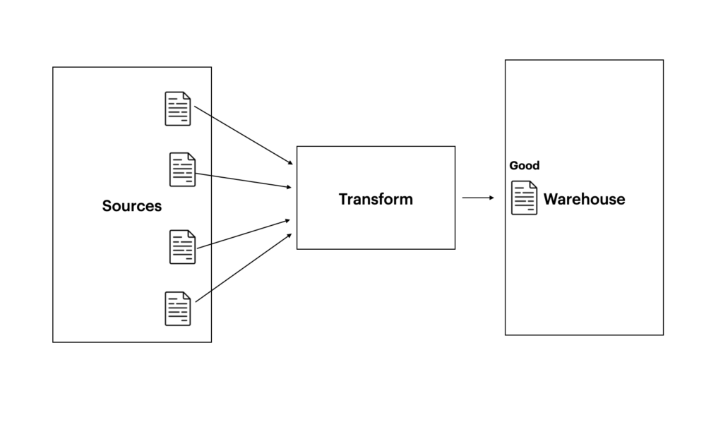 Trong ETL có 3 thành phần, đầu tiên là nguồn dữ liệu (sources) , thứ 2 là bộ phận transform ( nó có thể là 1 phần mềm được setup chạy ở đâu đó) có kết nối trực tiếp với sources và cuối cùng là 1 nơi dùng để lưu data có thể gọi là data ware house.