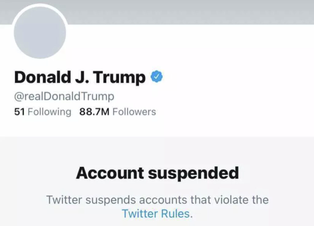 Ngoài ra còn có vụ việc Twitter xóa hoàn toàn sự hiện diện của tổng thống Trump khỏi nền tảng Twitter, và Twitter tự áp đặt tiêu chuẩn cộng đồng của họ lên nước Mĩ mà không cần thông qua luật lệ gì. Đây gần như là hành động tước đi quyền tự do của một người, và một số người còn cho rằng nó vi hiến đối với Mĩ.